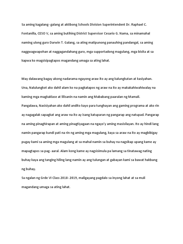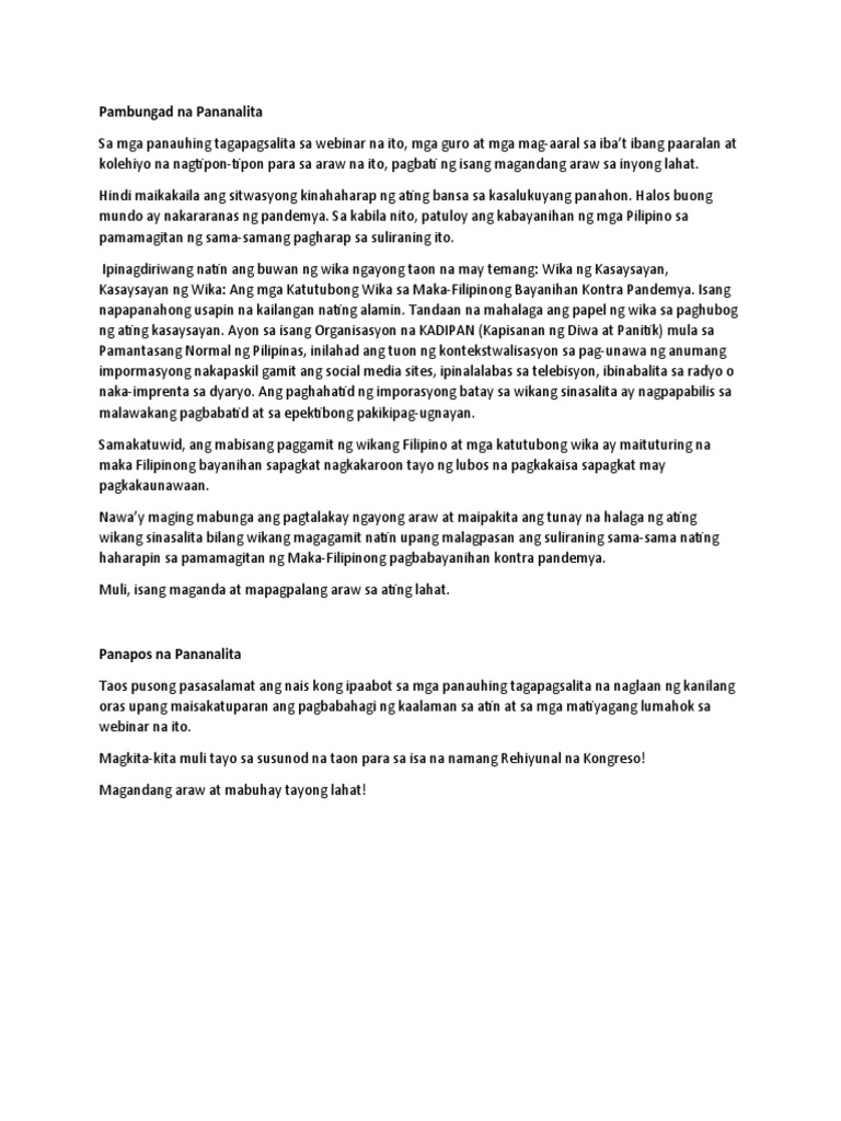 Pambungad na pananalita para sa sportsfest. 1 pagkuha sa pansin ng iyong tagapakinig 2 malinaw na pagbanggit sa iyong paksa at 3 pagpapakita kung bakit mahalaga ang paksa sa iyong tagapakinig. Sa araw na ito ay ating ipinagdiriwang ang kulminasyon ng Buwan ng Wika na may temang Filipino.