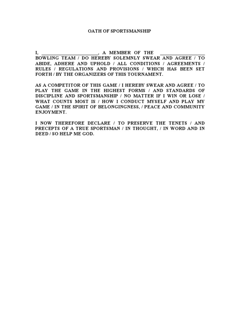 Script for the Oath Narrator. Officials oath in the name of all officials i pledge that we will take part in these games in the true spirit of sportsmanship understanding and interpreting the rules with complete impartiality for the glory of sport and the honour of fair play. Applause Emcee Okay lets meet the Teams Emcee and Game Announcer begin Team introduction and start of Match play protocol.