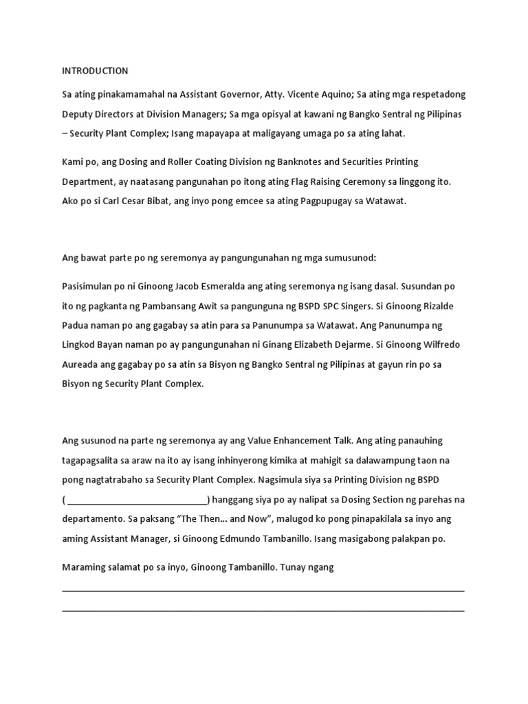 Feb 24 2019 - Explore Syasyeras board emcee script on Pinterest. A master of ceremony for a flag raising will want to have notes or a script to follow. 88 found this document useful Mark this document as useful.