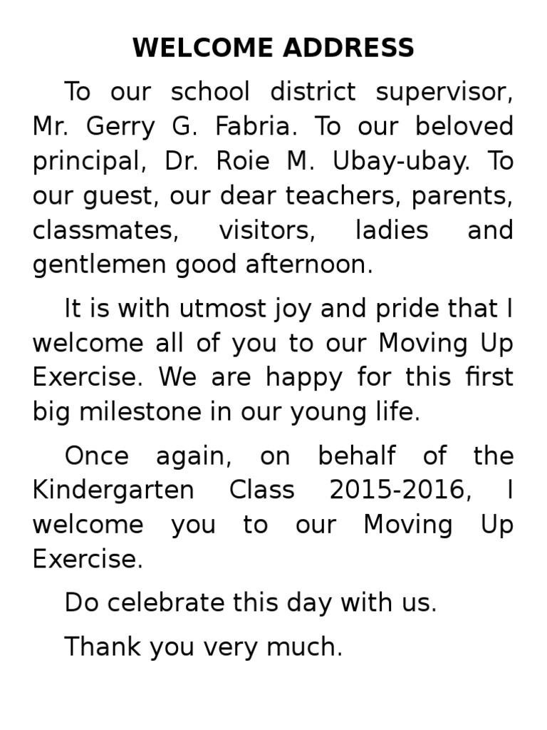 Moving up welcome remarks. 20th Moving-Up Ceremony Opening Remarks by Kit Estrada STPC batch 2001-2002. I was honored to have been chosen to deliver the Welcome Remarks and Keynote Speech during our Kindergarten Graduation ceremony at Merville Sacred Heart School on March 20 2010. Whenever I look at the faces waiting for me to give my welcome address I realize that I should not only welcome them but also express my gratitude for all of you taking the time to be here.