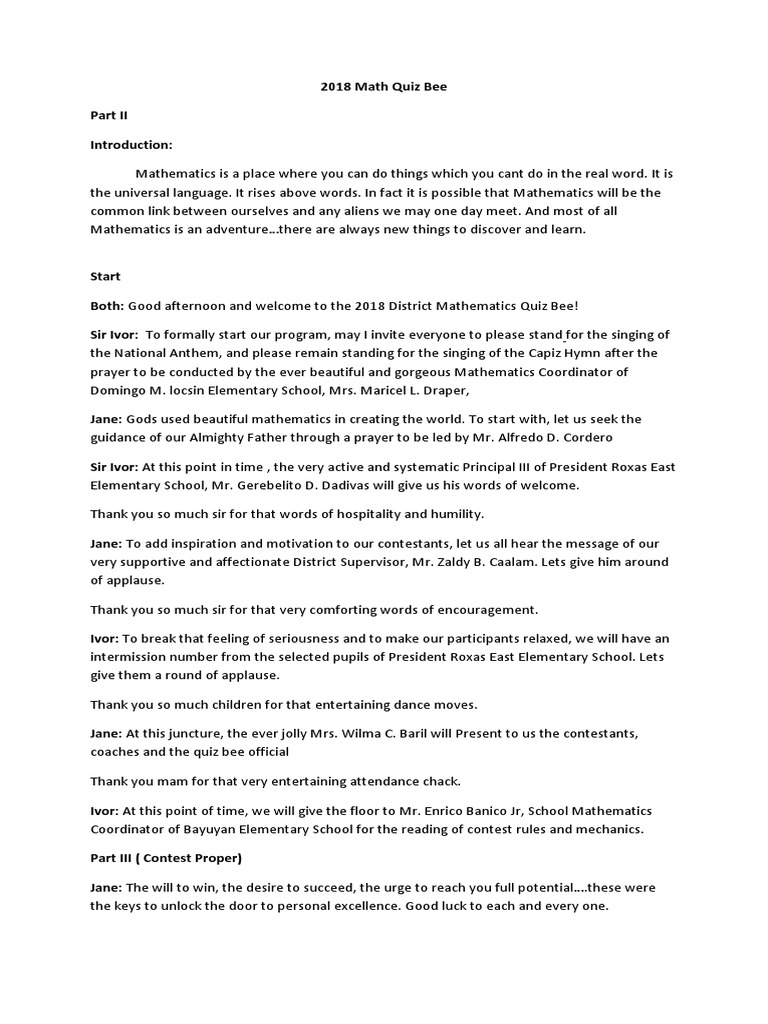 Science Month Celebration Opening and Closing Programs Hosting Script. Beginning June 12 spellers will compete virtually in the first three rounds of competition. You can conduct the school quiz bee by first finding a host at your school such as a teacher a teachers aide or a member of the schools administration.