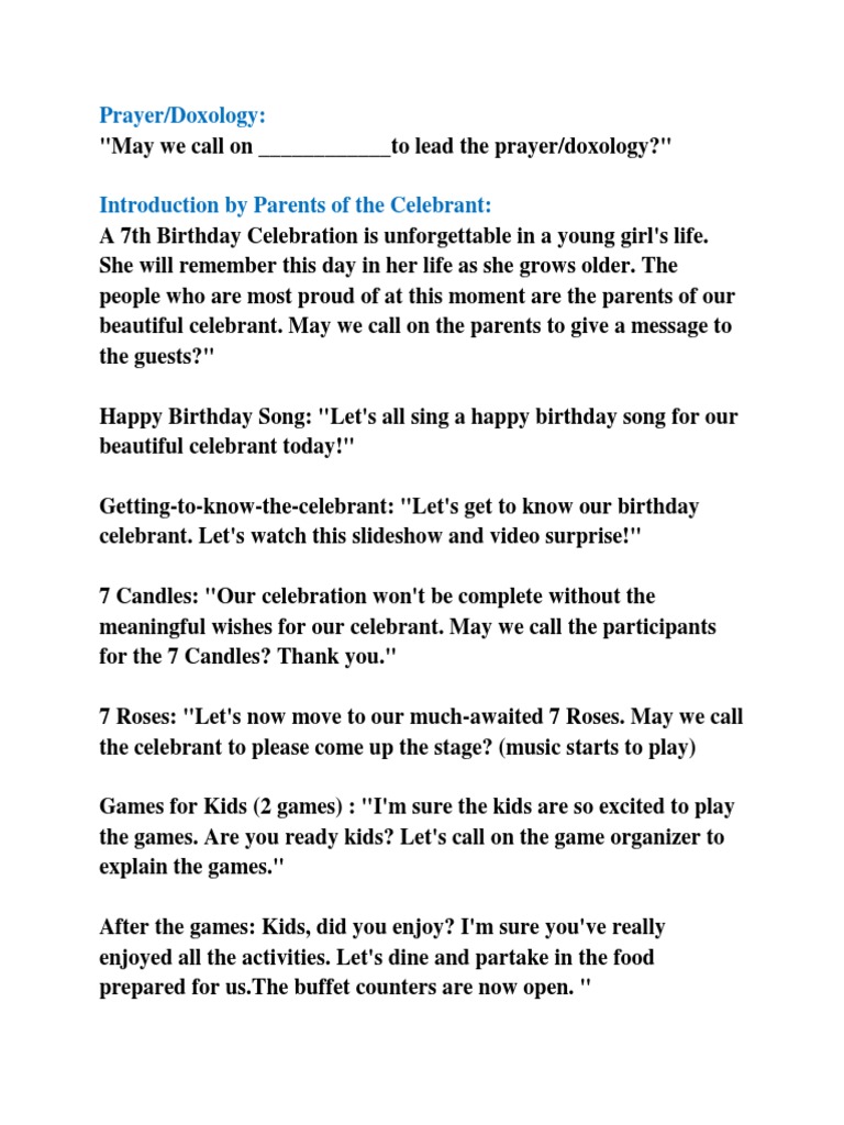 If you have a photo booth or other activity booths you may also ask guests to enjoy them before the program starts. Template Script for Emcees. EUNICE MICHAELA 7TH BIRTHDAY.