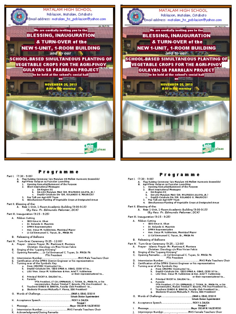 Programme Blessing Inauguration And Turn Over Of One Unit One Room Building At Matalam High School And School Based Simultaneous Planting Of Vegetable Crops For The Agri Pinoy Gulayan Sa Paaralan Project Ap Gpp