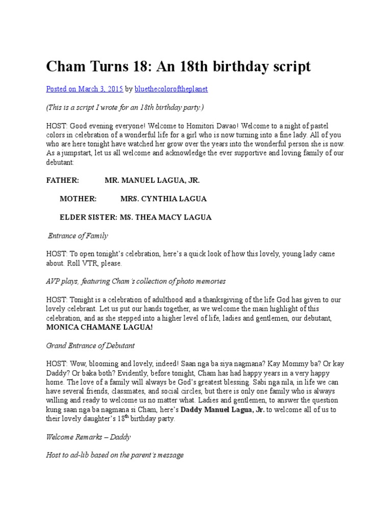 Good evening Emcee 1. Program flow and Script for Hosting a Birthday Party. Roses signify 18 very special gentlemen in the life of the debutant like her friends relatives fbrothers boyfriend and of course we can never forget the father for he is always the first or last.