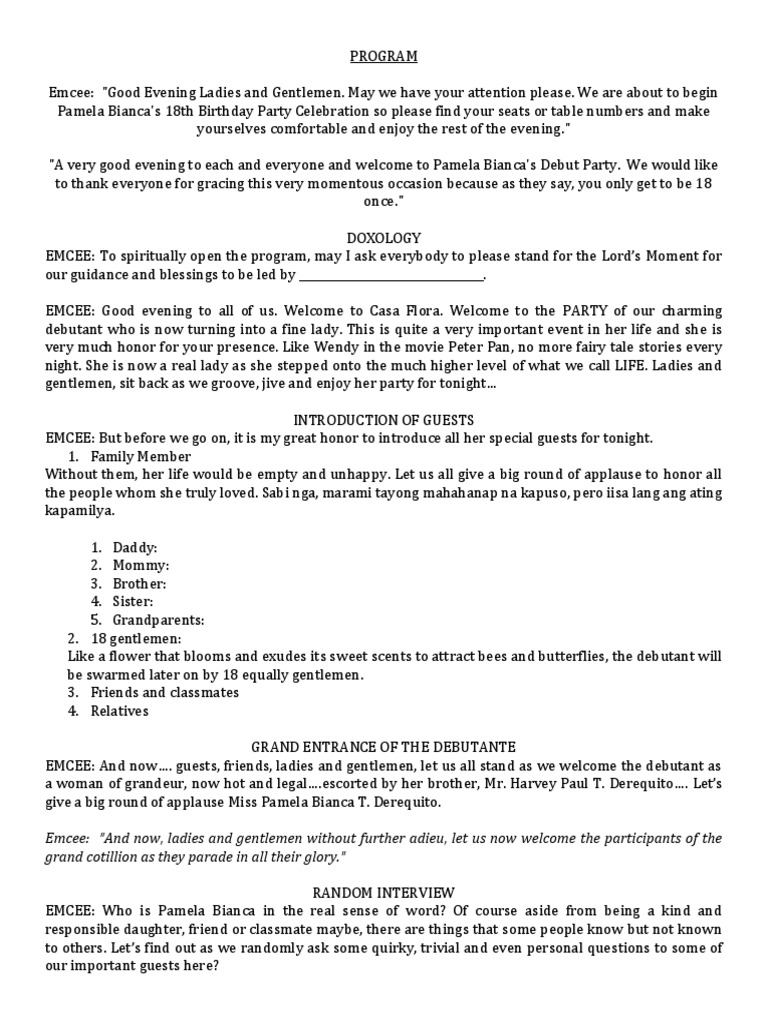 Software Free Download The debutantes program - debut website. Emcee Debutante Scripts Leisure June 2021 OUR CHARMING DEBUTANT IS NOW TURNING INTO A FINE LADY AND THIS IS QUITE AN IMPORTANT EVENT IN HER LIFE AND HER FAMILY IS VERY MUCH HONORED FOR YOUR PRESENCE. We are very lucky for we are chosen to be here and be part of this momentous occasion in the debutants life.