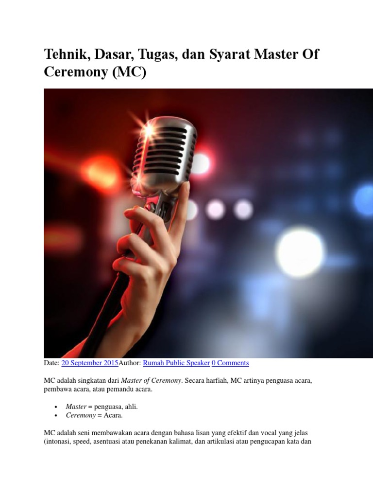 Apa itu MC Master ofceremony Orang yang bertugas memandu acara dan bertanggung jawab atas lancar dan suksesnya acara. It is a wonderful and precious chance for me to be your MasterMisteress of Ceremony. Namun ada banyak penunjang yang perlu juga diperhatikan serius.