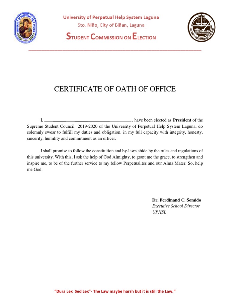 An oath of office is an oath sworn by an elected official under which the person accepts the responsibilities of office and undertakes to carry out the office in accordance with law. The installing officer will then call each newly elected or reelected officer and when they are all in place says I now ask you to take your oath of office. Supreme Student Government Officers together with Senior High School Vice Principal Ms.