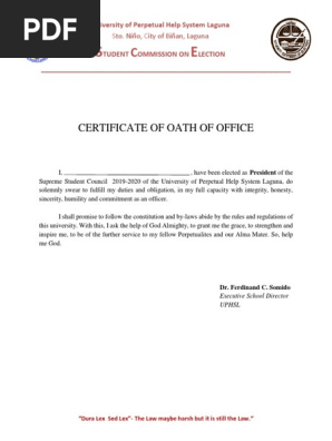 Oath of Office of Club Officers - Free download as Word Doc doc PDF File pdf Text File txt or read online for free. You have accepted the responsibility to fulfill the duties of the offices to which you have been elected and therefore before you. In most cases the oath is a traditional statutory-based oath which is required by connection with the constitution of the electoral jurisdiction.