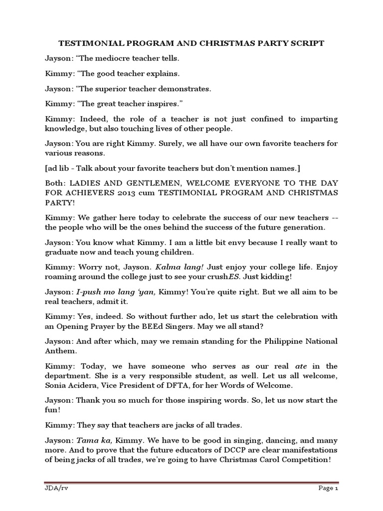 Script christmas party program. In the programme today were going to hear about a special kind of Christmas party - not the kind you have at home for friends - but what we call the office Christmas party or less formally the office Christmas do. Typically these parties take place outside the office so as Christmas approaches Londons bars restaurants and. Emcee script para ay isang christmas party.