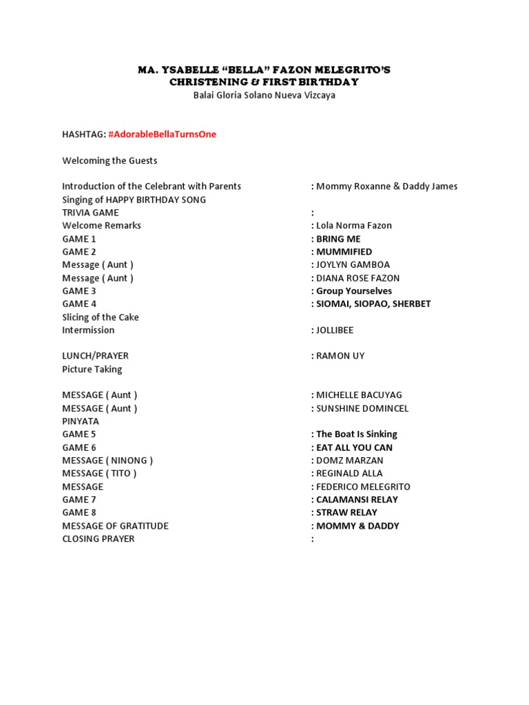 Sample emcee script 75 8 9375. Christening First Birthday - Free download as Word Doc doc docx PDF File pdf Text File txt or read online for free. Program Flow and Script for Baptism Party at the Reception.