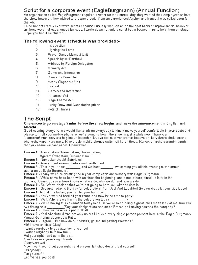 Emcee 1- A very good evening ladies and gentlemen. Emcee Script for Event Emcee Script for Wedding youll find some useful bits here. We know you will find plenty of useful material.