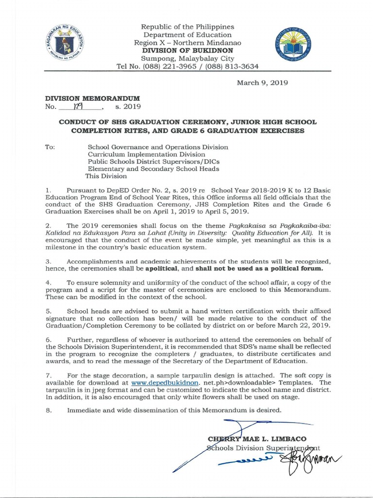 The school head shall wrap up the ceremonies inspire parents to continue supporting the education of the children and make relevant announcements on upcoming school-related activities. DM 585 s. The following are the highlights of the released department order dated February 18 2019.