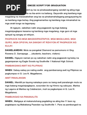 Examples of tagalog script for emcee. Save Save Graduation Script Tagalog For Later 81 81 found this document useful Mark this document as useful 19 19 found this document not useful Mark this document as not useful. We hope that the school year has begun successfully for you and your families.