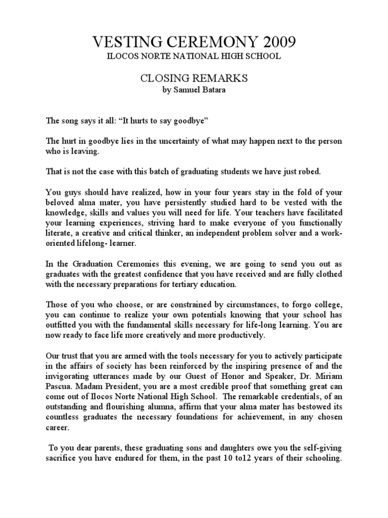 Here is a sample script for use in planning your opening remarks. CLOSING REMARKS for COMMENCE MENT EXCERCISES By. Estrellado Good Evening Ladies Gentlemen Before we close this evenings ceremonies Id like to take this last opportunity to say on behalf of the faculty staff and administration of GSCI congratulations both the graduates and the family and friends who have.